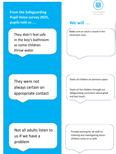 Pupils across school from Year 1 up to Year 6 were asked questions regarding how they feel about Safeguarding at Penny Oaks. This was done across April, May and June 2025.